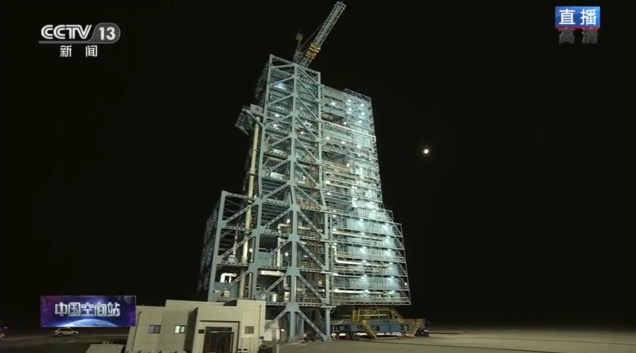 發射塔架頂部的第四組回轉平臺已打開,露出火箭逃逸塔。