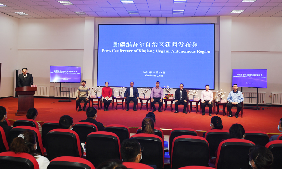 10月15日,新疆維吾爾自治區在阿克蘇地區沙雅縣舉辦棉花專場新聞發布會。面對媒體,伊敏·阿納耶體和其它6位來自周邊縣市的棉花從業者講述他們與棉花的故事,分享了自己的幸福密碼。