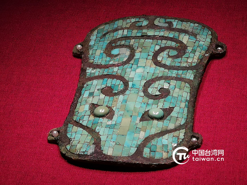 二里頭遺址出土的鑲嵌綠松石獸面紋銅牌飾。上有數(shù)百片綠松石拼合鑲嵌出獸面紋,加工精巧,絲絲入扣,雖歷經(jīng)三四千年卻無一松動(dòng)脫落。(中國臺(tái)灣網(wǎng) 李杰 攝)