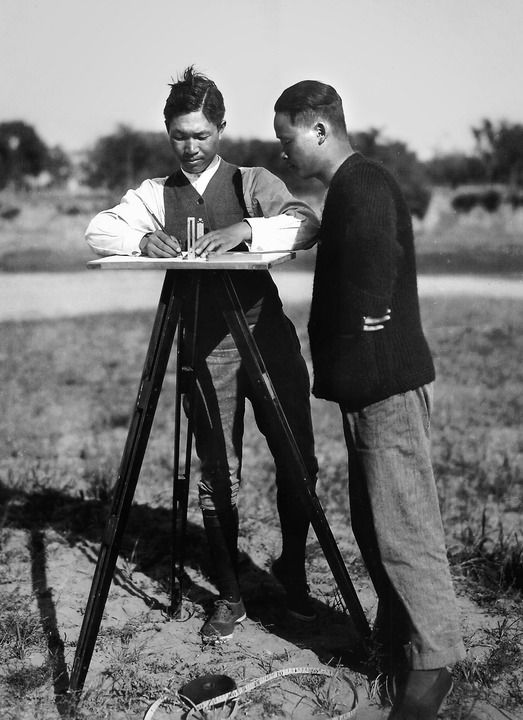 殷墟第一次發掘,董作賓(右)參與測量繪圖(資料照片)。新華社發(安陽市殷墟博物館提供)
