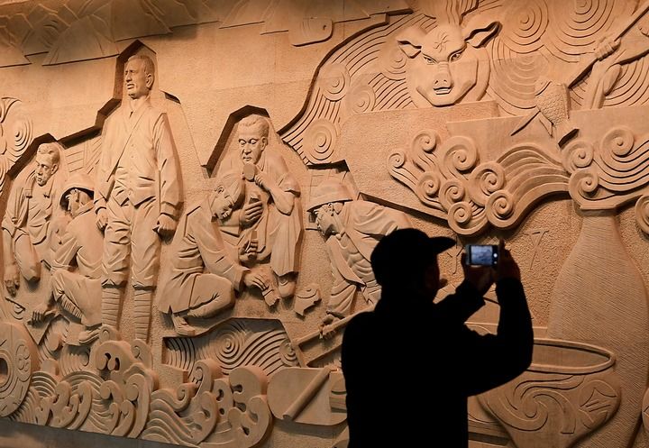 參觀者在仰韶文化博物館內拍攝浮雕(10月15日攝)。新華社記者 李安 攝