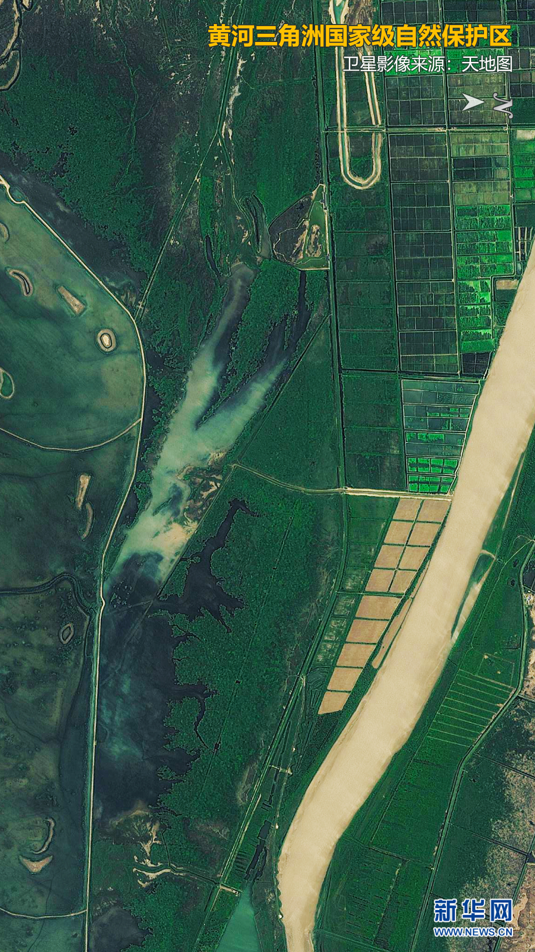 ▲衛(wèi)星視角下的黃河三角洲國家級自然保護區(qū)。衛(wèi)星影像來源:天地圖