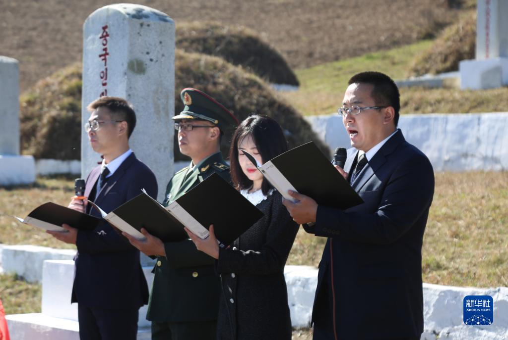 10月23日,在朝鮮咸鏡南道西北部長(zhǎng)津湖畔的長(zhǎng)津邑中國(guó)人民志愿軍烈士合葬墓地,中國(guó)駐朝鮮大使館外交官代表朗誦獻(xiàn)給長(zhǎng)眠于此的志愿軍英烈的祭文。新華社記者 江亞平 攝