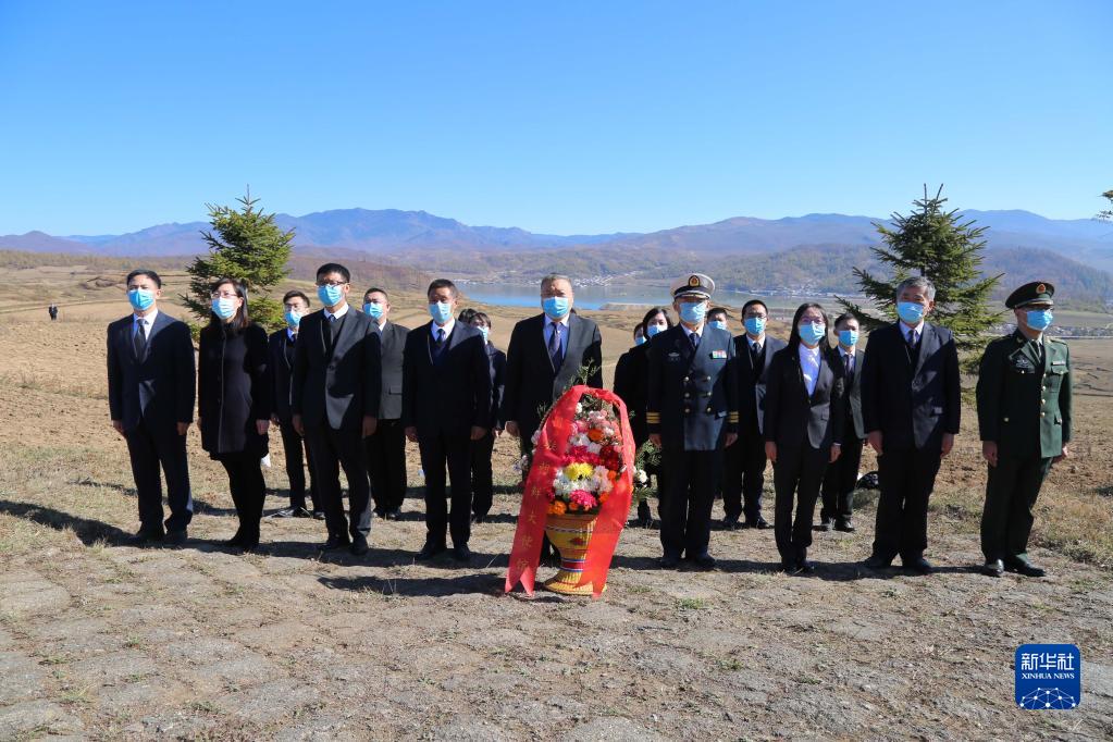 10月23日,在朝鮮咸鏡南道西北部長(zhǎng)津湖畔的長(zhǎng)津邑中國(guó)人民志愿軍烈士合葬墓地,中國(guó)駐朝鮮大使館外交官向烈士獻(xiàn)花并默哀致敬。新華社記者 江亞平 攝