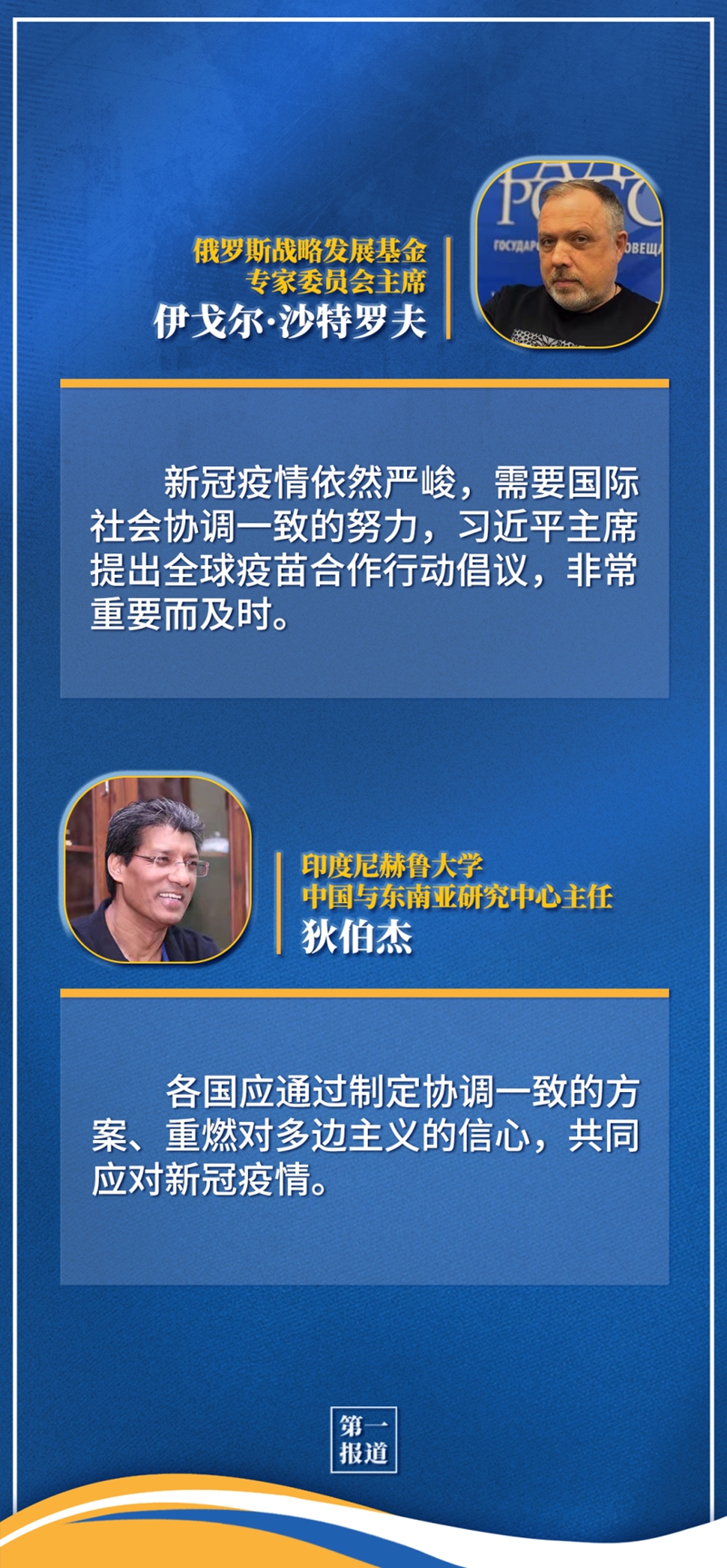 多國人士認(rèn)為,習(xí)近平主席就全球抗疫、經(jīng)濟(jì)復(fù)蘇等提出的主張意義重大,充分展現(xiàn)了中國負(fù)責(zé)任大國的擔(dān)當(dāng),將有力推動(dòng)全球團(tuán)結(jié)合作與共同發(fā)展。
