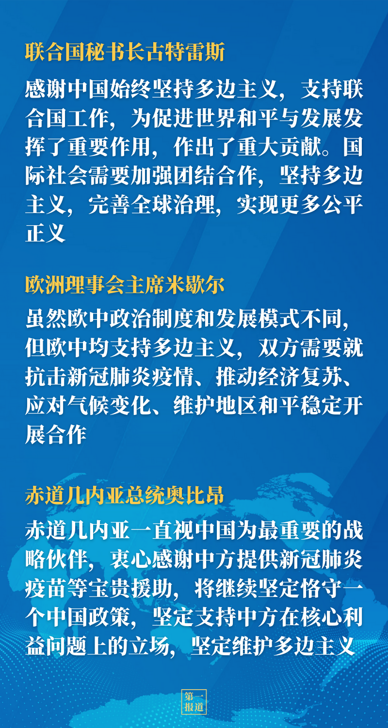 在同聯(lián)合國秘書長古特雷斯、歐洲理事會主席米歇爾、巴基斯坦總理伊姆蘭·汗、巴布亞新幾內(nèi)亞總理馬拉佩、赤道幾內(nèi)亞總統(tǒng)奧比昂等國際和地區(qū)組織以及國家領導人的交流中,習近平主席都分別同各方就堅持真正的多邊主義深入交流,獲得積極反饋——