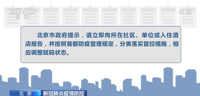北京市政府提示,請立即向所在社區、單位或入住酒店報告,并按照首都防疫管理規定,分類落實管控措施,相應調整賦碼狀態。