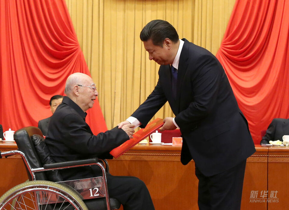 2014年度國(guó)家科學(xué)技術(shù)獎(jiǎng)勵(lì)大會(huì)上,習(xí)近平總書記彎下腰向坐在輪椅上的中國(guó)科學(xué)院院士于敏頒發(fā)2014年度國(guó)家最高科學(xué)技術(shù)獎(jiǎng)。