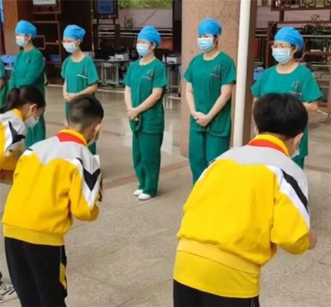 11月3日,佛山市南海區(qū)第四人民醫(yī)院的醫(yī)護(hù)人員接種完上午場(chǎng)疫苗后,南海區(qū)西樵第二小學(xué)的學(xué)生們?cè)诶蠋煄ьI(lǐng)下,利用午休的時(shí)間,向現(xiàn)場(chǎng)醫(yī)護(hù)人員鞠躬感謝,并深情演唱歌曲《有你就幸福》。