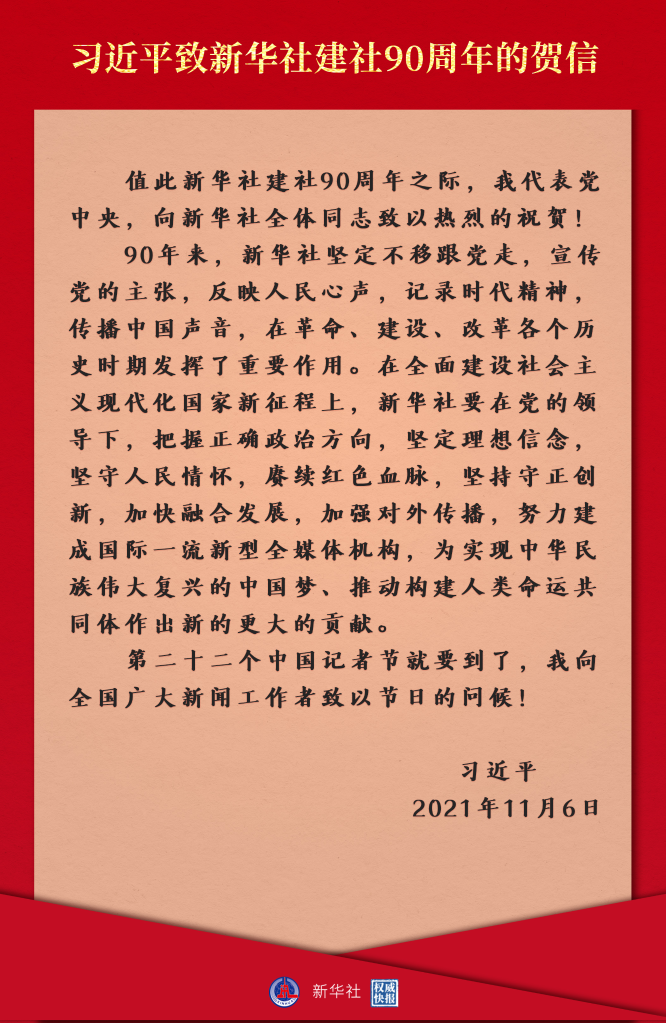 今年11月6日,在新華社建社90周年之際,習(xí)近平總書(shū)記專門(mén)致信祝賀,寄語(yǔ)新華社:要在黨的領(lǐng)導(dǎo)下,把握正確政治方向,堅(jiān)定理想信念,堅(jiān)守人民情懷,賡續(xù)紅色血脈,堅(jiān)持守正創(chuàng)新,加快融合發(fā)展,加強(qiáng)對(duì)外傳播,努力建成國(guó)際一流新型全媒體機(jī)構(gòu)。
