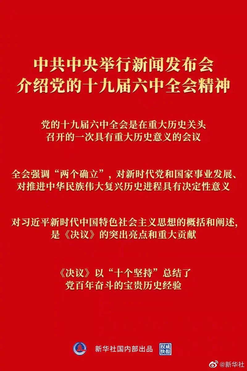 【權威快報丨中共中央舉行新聞發布會介紹黨的十九屆六中全會精神】11月12日上午10時,中共中央舉行新聞發布會,介紹黨的十九屆六中全會精神,回答記者問題。發布會介紹:黨的十九屆六中全會是在重大歷史關頭召開的一次具有重大歷史意義的會議;全會強調“兩個確立”,對新時代黨和國家事業發展、對推進中華民族偉大復興歷史進程具有決定性意義;對習近平新時代中國特色社會主義思想的概括和闡述,是《決議》的突出亮點和重大貢獻;《決議》以“十個堅持”總結了黨百年奮斗的寶貴歷史經驗等。(記者丁小溪,海報設計楊軼群)