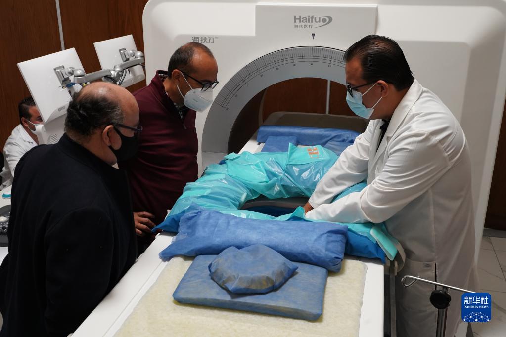 8月23日,在墨西哥普埃布拉州喬盧拉市腫瘤消融醫(yī)學中心,重慶海扶醫(yī)療的墨方合作醫(yī)生向到訪醫(yī)生演示“海扶刀”治療系統。新華社記者 朱雨博 攝