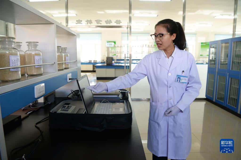 黑龍江北大荒建三江國家農(nóng)業(yè)科技園區(qū)工作人員裴鑫宇在做谷物品質(zhì)檢測(2018年9月27日攝)。新華社記者 王凱 攝