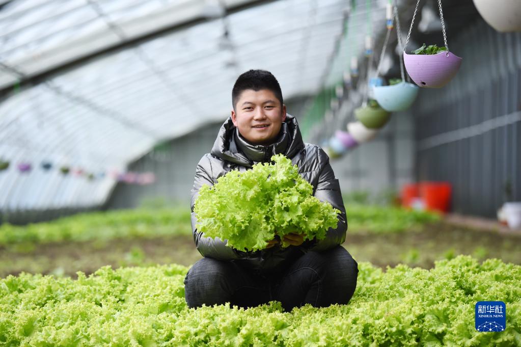 在黑龍江北大荒農(nóng)墾集團(tuán)雙峰農(nóng)場有限公司果蔬產(chǎn)業(yè)園區(qū)智控溫室,工作人員在展示剛采摘的生菜(2021年3月5日攝)。新華社記者 王建威 攝
