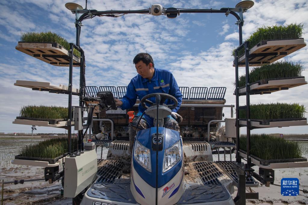 在北大荒集團(tuán)紅衛(wèi)農(nóng)場有限公司智慧農(nóng)業(yè)先行示范區(qū)內(nèi),工作人員設(shè)置無人駕駛插秧機(jī)工作路徑(2021年5月11日攝)。新華社記者 張濤 攝