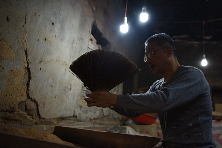 作為中外文明交匯的產物,永春香頗為講究“手藝”。沾水打底、展香、掄香、切香、染香、曬香、跺香……一尺長的永春香背后,經歷了十多道工序的層層疊加。