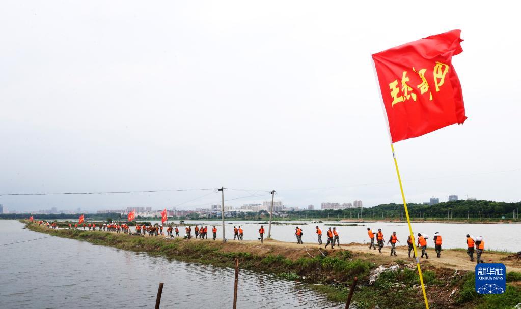 陸軍第71集團軍某合成旅王杰生前所在連官兵跟隨部隊在江西共青城市共青聯圩共大圩段加固防洪堤壩(2020年7月19日攝)。新華社發(李志浩 攝)