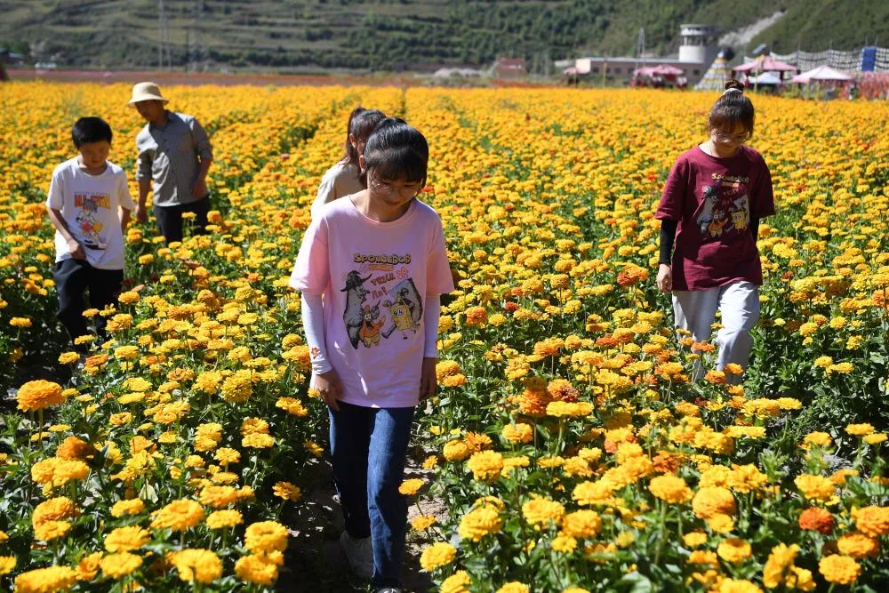幾名游客在甘肅省甘南藏族自治州卓尼縣木耳鎮力賽村的花海游覽(9月11日攝)。新華社記者 陳斌 攝