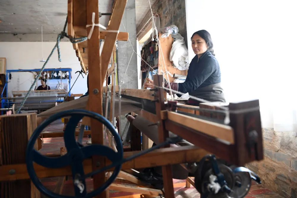 在甘肅省甘南藏族自治州夏河縣阿木去乎鎮加科村,村民周毛吉在車間使用傳統木式紡織機編織手工藝品(9月9日攝)。 新華社記者 陳斌 攝