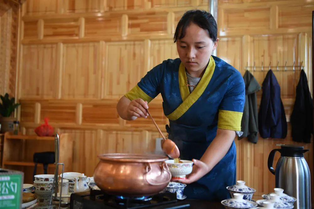 在甘肅省甘南藏族自治州卓尼縣木耳鎮力賽村的一家農家樂里,村民拉姆卓瑪為客人盛湯(9月11日攝)。新華社記者 陳斌 攝