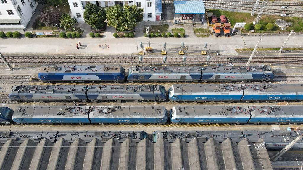 這是11月23日拍攝的停靠在成都機務段的中歐班列編組和諧型機車頭(無人機照片)。新華社記者胥冰潔攝
