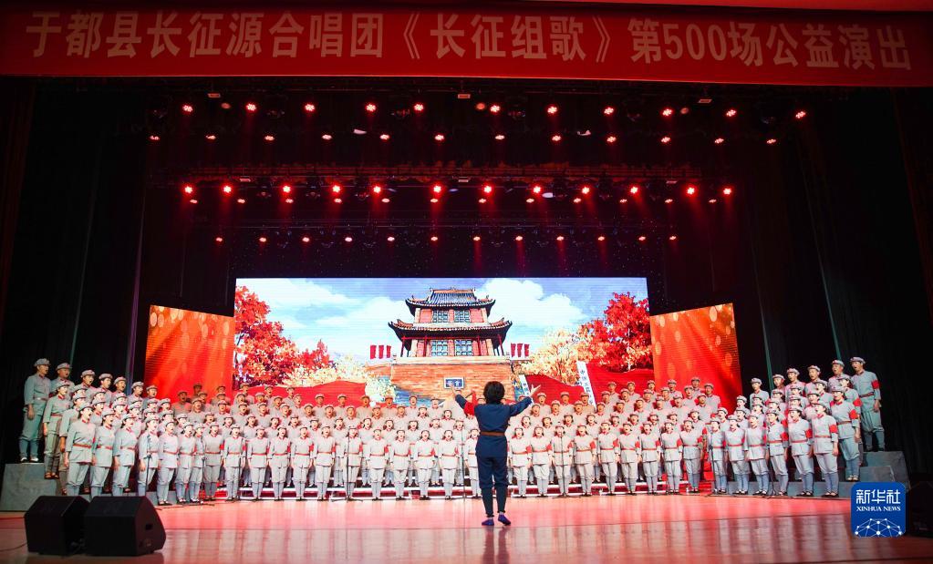 江西省于都縣長征源合唱團在該縣文化藝術中心進行第500場《長征組歌》公益演出(5月19日攝)。新華社記者 陳曄華 攝