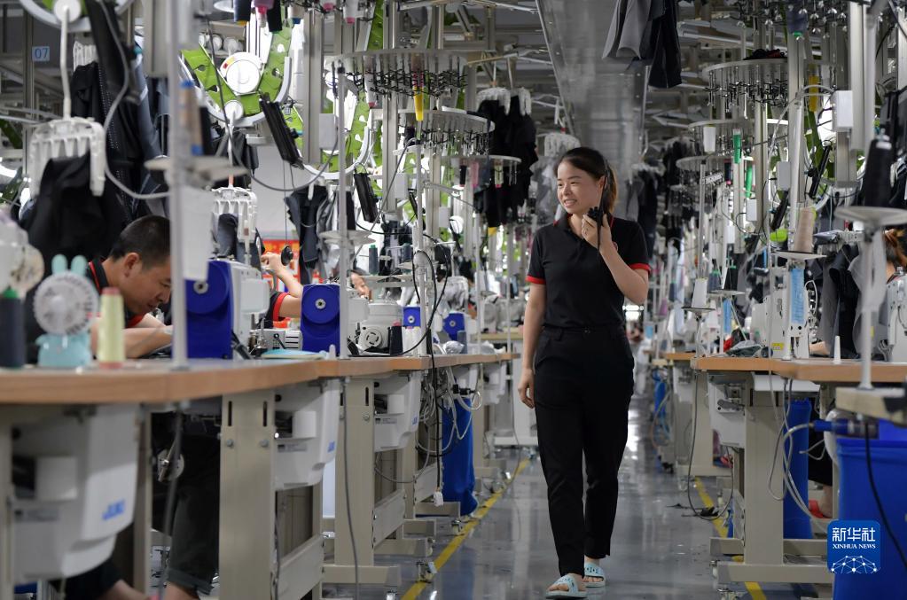 在江西省于都縣一家服裝生產基地內,生產小組小組長在巡查生產線(2020年7月17日攝)。新華社記者 彭昭之 攝