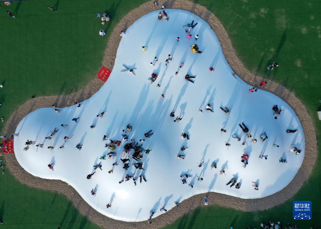 在江西省贛州市章貢區沙河鎮的羅坑體育特色小鎮,游客在體驗戶外蹦床項目(2020年11月15日攝,無人機照片)。新華社記者 彭昭之 攝