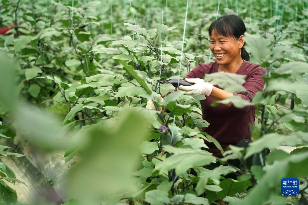 在江西省贛州市于都縣梓山鎮潭頭村的果蔬種植基地,村民在采摘茄子(2020年10月21日攝)。新華社記者 萬象 攝