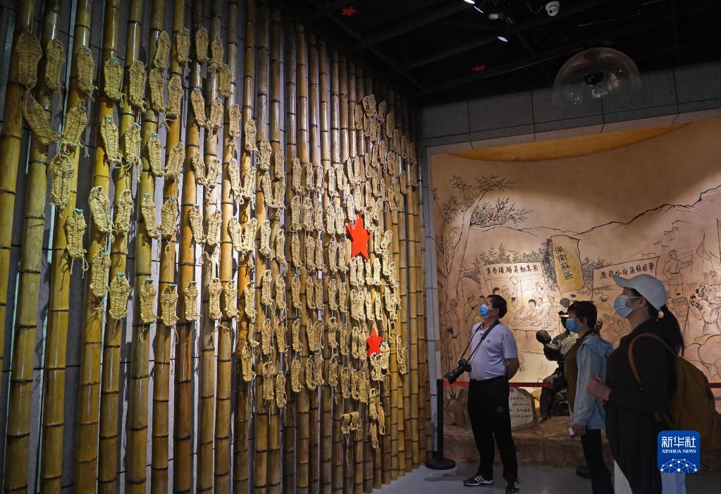 在江西省于都縣中央紅軍長征出發紀念館,游客在參觀草鞋組成的“草鞋墻”(4月30日攝)。新華社記者 萬象 攝