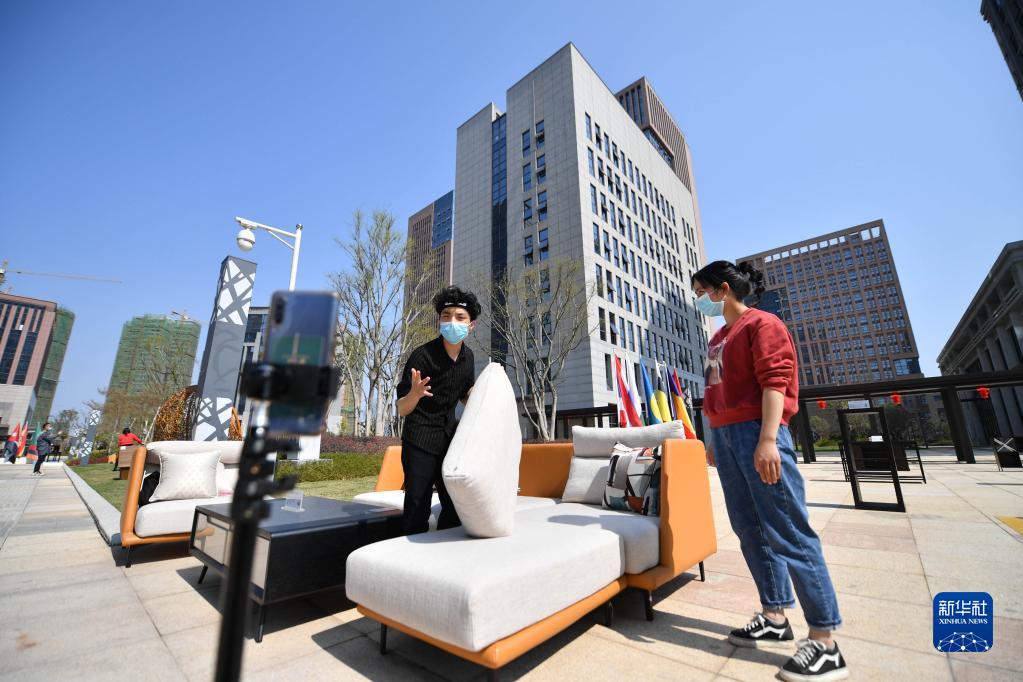 在江西省贛州市南康區跨境電商產業園,員工通過手機直播的形式推銷家具(2020年2月26日攝)。新華社記者 胡晨歡 攝