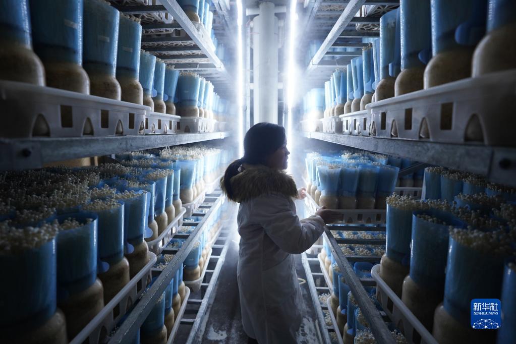 江西省贛州市章貢區火燃村一家菌菇企業,工人在查看金針菇長勢(2020年11月12日攝)。新華社記者 周密 攝