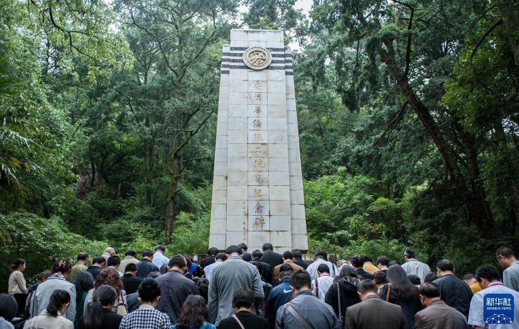 參加南洋華僑機工抗日紀念碑瞻仰活動的全體人員在云南省昆明市西山森林公園的南洋華僑機工抗日紀念碑前默哀(2015年9月8日攝)。新華社記者 呂帥 攝