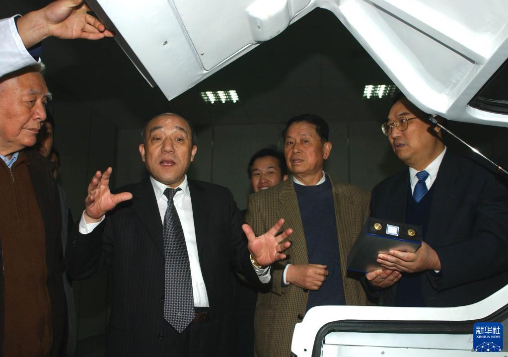 魯冠球(左二)向參觀者介紹萬向集團研發電動汽車的情況(資料照片)。新華社發