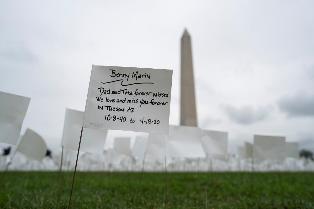 △9月17日,寫有緬懷親人詞句的白色旗幟擺放在美國首都華盛頓的華盛頓紀念碑附近的草坪上。