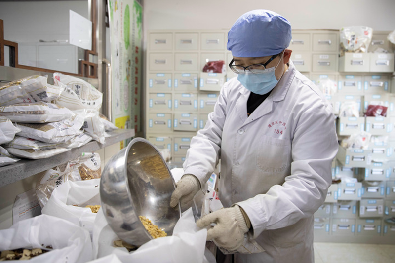 12月7日,在哈爾濱市道里區(qū)中醫(yī)醫(yī)院,工作人員在調(diào)配中藥用料。(新華社記者張濤 攝)