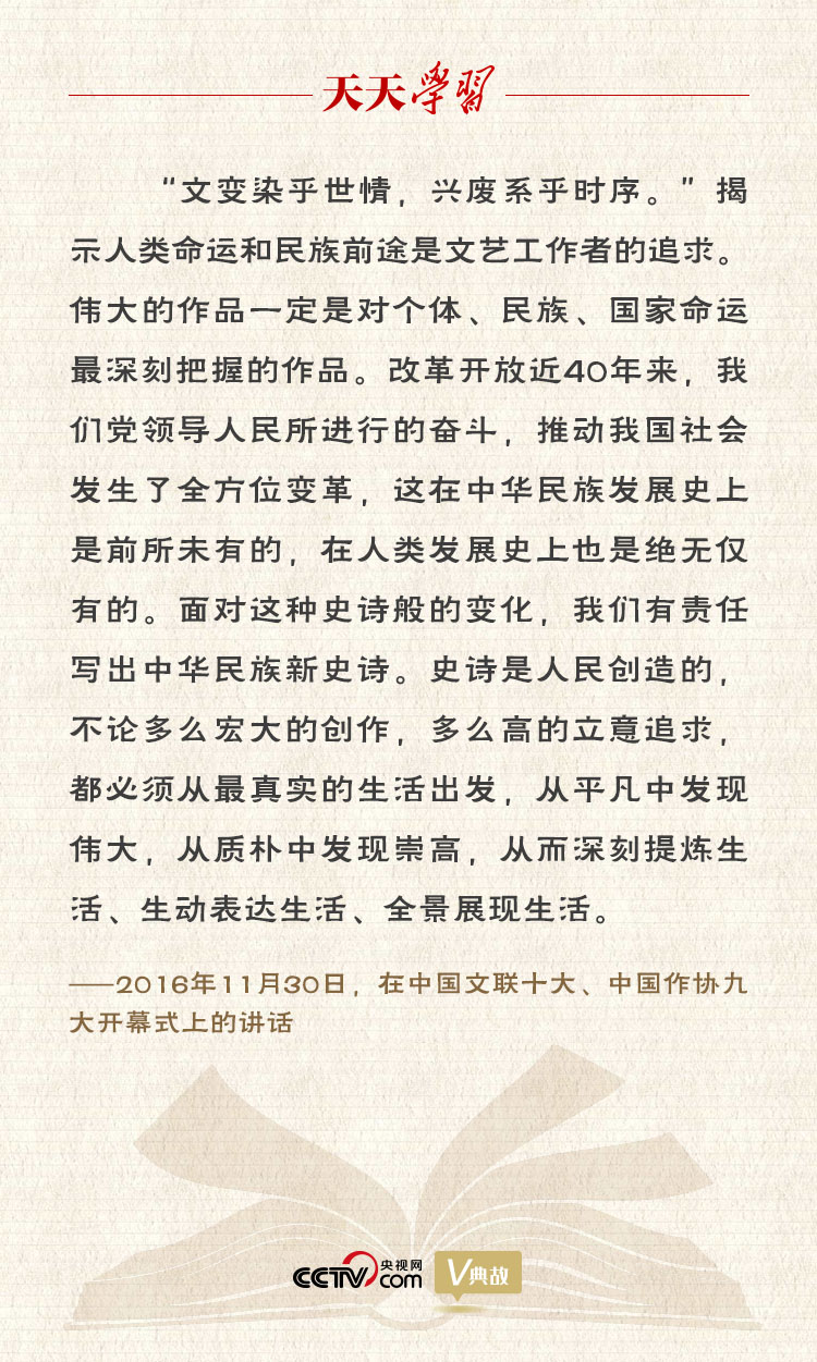反映時代,關(guān)鍵在于深入生活、扎根人民。習近平總書記指出:“社會是一本大書,只有真正讀懂、讀透了這本大書,才能創(chuàng)作出優(yōu)秀作品。”當下,我國文藝創(chuàng)作之所以存在著有數(shù)量缺質(zhì)量、有“高原”缺“高峰”的現(xiàn)象,存在著抄襲模仿、千篇一律的問題,究其原因,就與一部分文藝工作者脫離時代生活的浮躁之風有關(guān)。文藝只有植根現(xiàn)實生活、緊跟時代潮流,才能發(fā)展繁榮;只有順應人民意愿、反映人民關(guān)切,才能充滿活力。