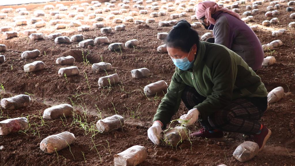 寒冬時節,呼嘯的北風從高原上猛烈吹過,四下一片荒蕪冷清。而在王和平的大棚里,大伙正揮舞著鐵鍬,將菌棒埋進土里,不少人把毛衣外套掛在棚壁上,熱火朝天的氣息與棚外的寒意形成了鮮明對比。