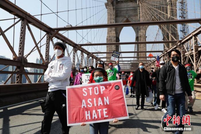 當?shù)貢r間4月4日,紐約舉行反仇恨亞裔大游行,上萬民眾手持標語在曼哈頓弗利廣場集會后,游行穿過布魯克林大橋至布魯克林卡德曼廣場。圖為游行隊伍中手持“停止仇恨亞裔”標語的亞裔孩童。 中新社記者 廖攀 攝