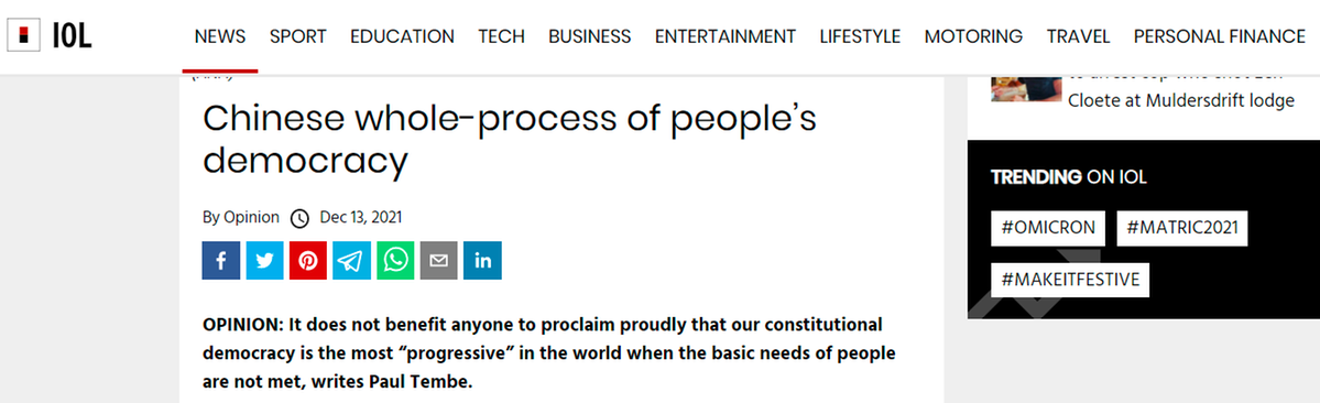 中國日報網(wǎng)12月21日電 12月13日,南非大學(xué)姆貝基非洲領(lǐng)導(dǎo)力研究院高級研究員譚哲理(Paul Tembe)在南非獨(dú)立在線新聞網(wǎng)站(IOL)發(fā)表評論文章,積極評價中國的全過程人民民主,認(rèn)為中國的民主制度實(shí)現(xiàn)了良政善治,南非可以從中學(xué)習(xí)借鑒以更好服務(wù)本國人民。