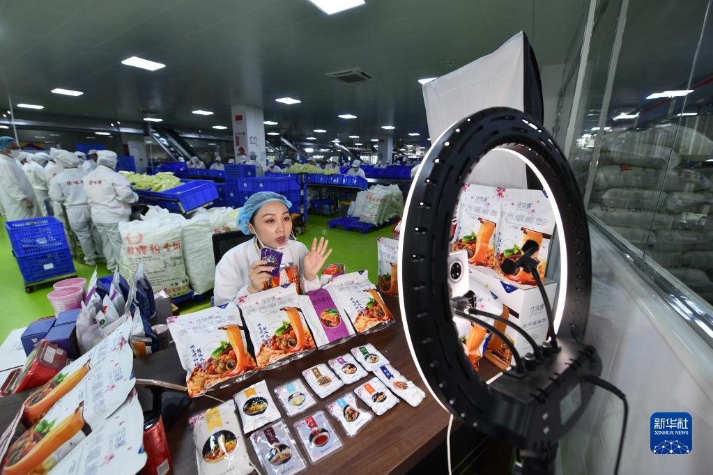 在廣西一家螺螄粉生產(chǎn)企業(yè)車間,工作人員在直播銷售螺螄粉(6月17日攝)。新華社記者 黃孝邦 攝