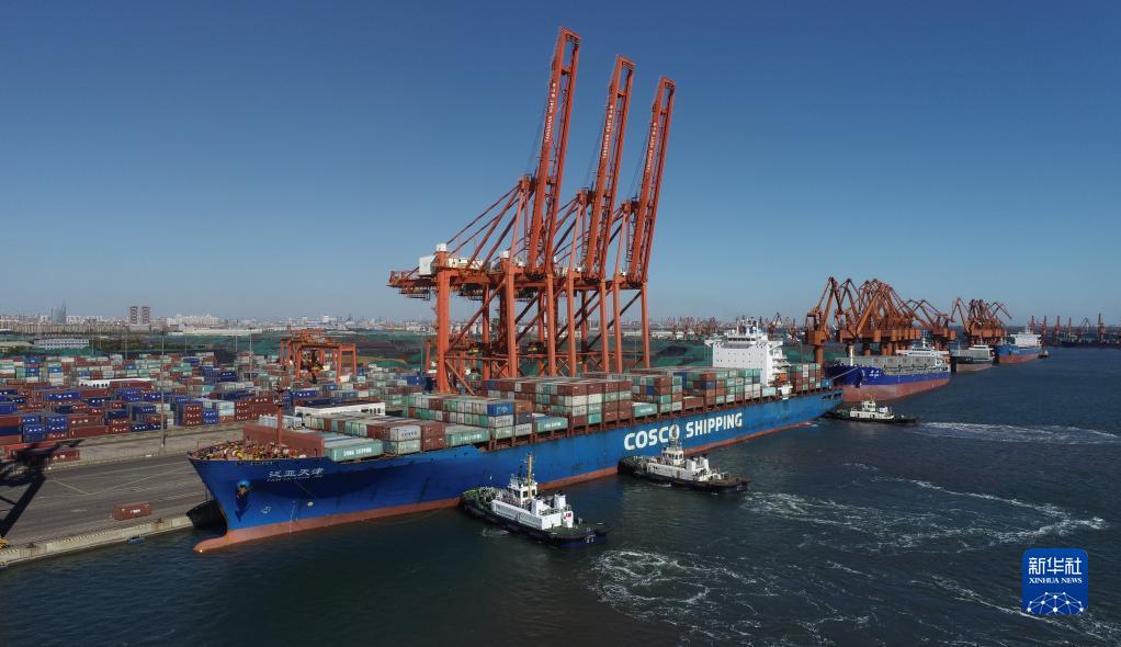 10月23日,一艘輪船在拖輪的協(xié)助下向唐山港京唐港區(qū)集裝箱碼頭靠泊(無人機照片)。新華社記者 朱旭東 攝