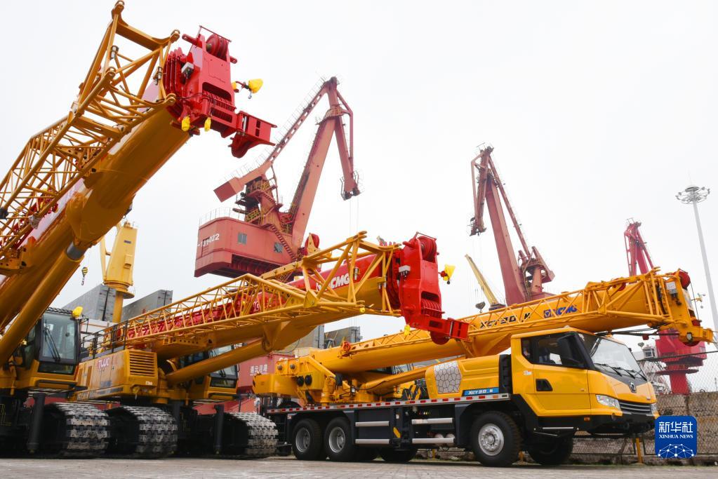 一批工程機械設備在江蘇連云港港口碼頭集結(jié)等待裝船出口(5月31日攝)。新華社發(fā)(耿玉和 攝)