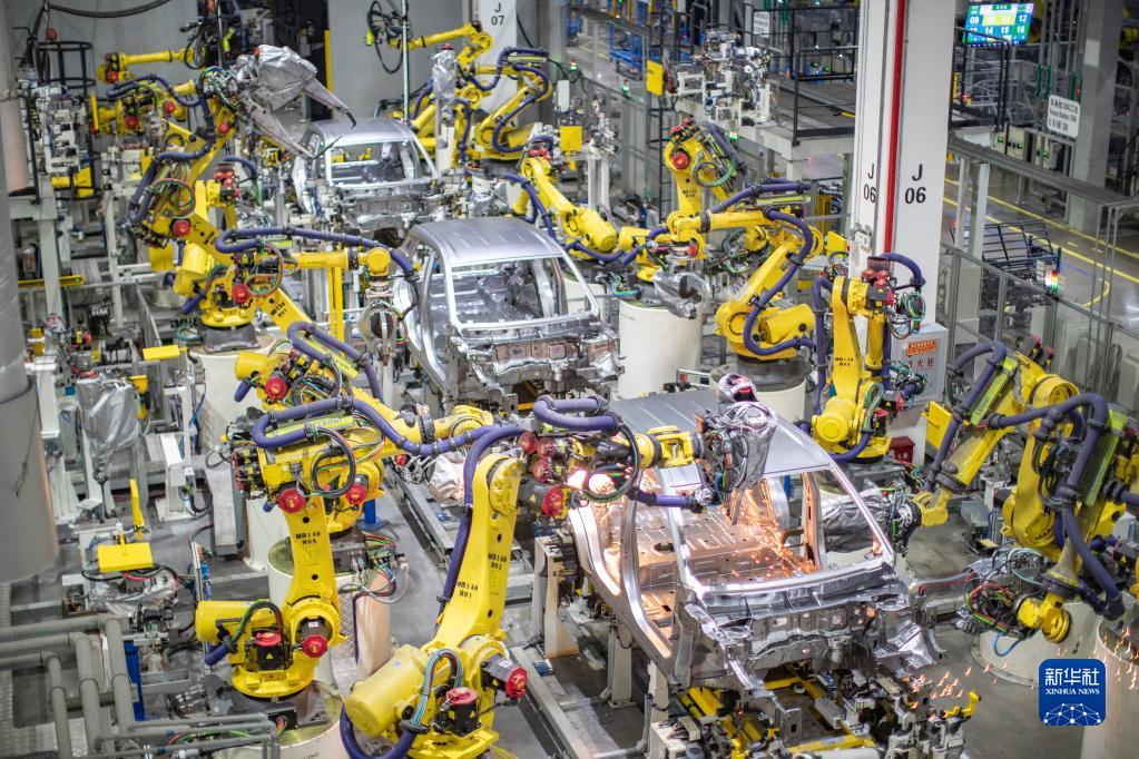 重慶一家新能源汽車企業(yè)使用智能化焊接機器人進行焊接作業(yè)(4月2日攝)。新華社記者 黃偉 攝