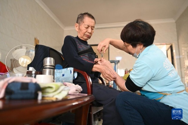 11月25日,長護險居家護理服務機構晉江鄰鹿養老服務有限公司護理員林銀花在福建晉江梅嶺街道蔡厝社區的老人家里開展定期居家護理服務。新華社記者 林善傳 攝