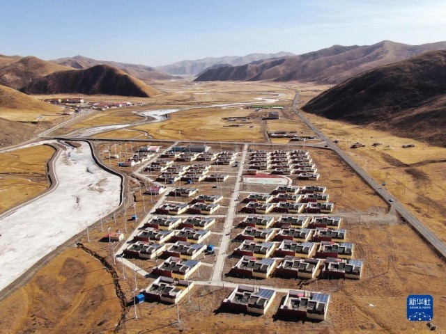 這是1月11日拍攝的青海省果洛藏族自治州甘德縣上貢麻鄉隆亞村搬遷點全貌(無人機照片)。新華社記者 張龍 攝
