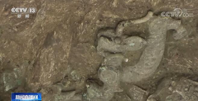 三星堆遺址祭祀區考古工作隊 趙昊:有點像1號神樹上面有一條龍是從神樹上面向下,從天而降的那個時候身體是朝上的。我們現在推測這個器物并不是全部的部分,而只是一個更大器物的一個基座或者底部的部分。