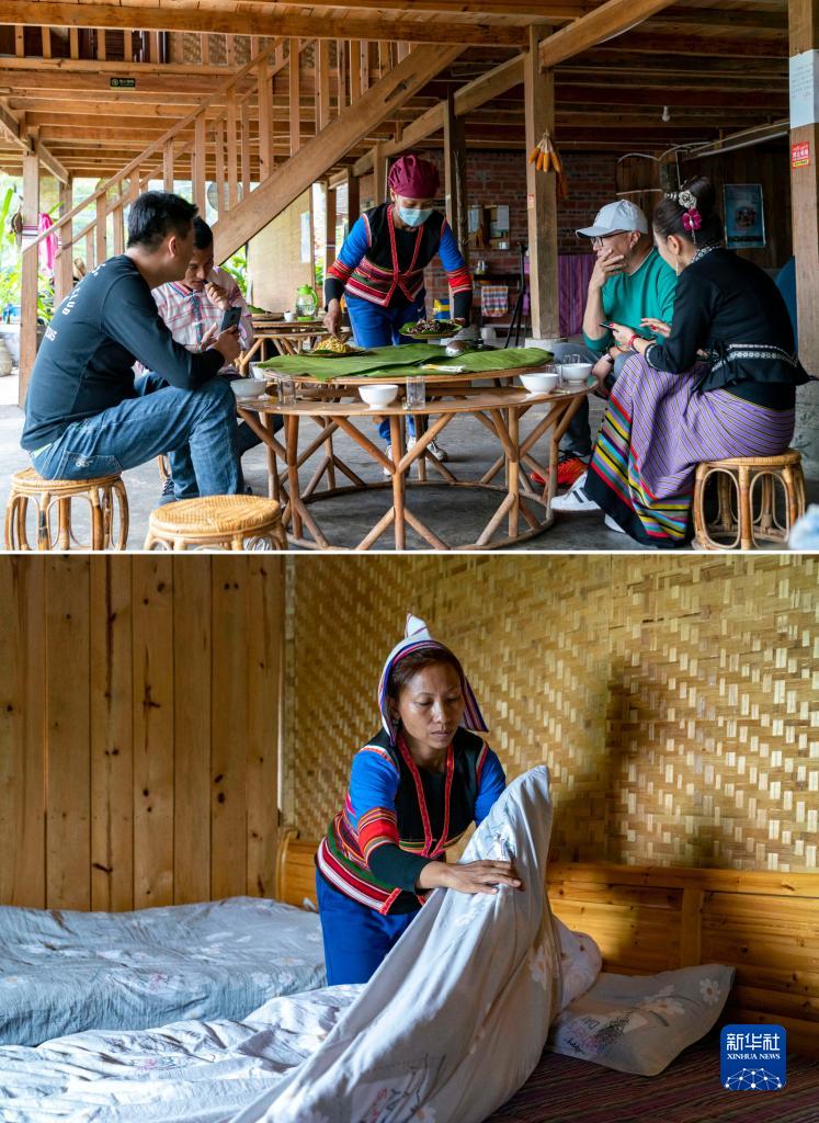 拼版圖片:上圖為基諾族村民姿梅(中)在自家開辦的農家樂里為游客端上基諾族美食(12月12日攝);下圖為基諾族村民姿梅在自家開辦的民宿里整理床鋪(12月12日攝)。新華社記者 陳欣波 攝