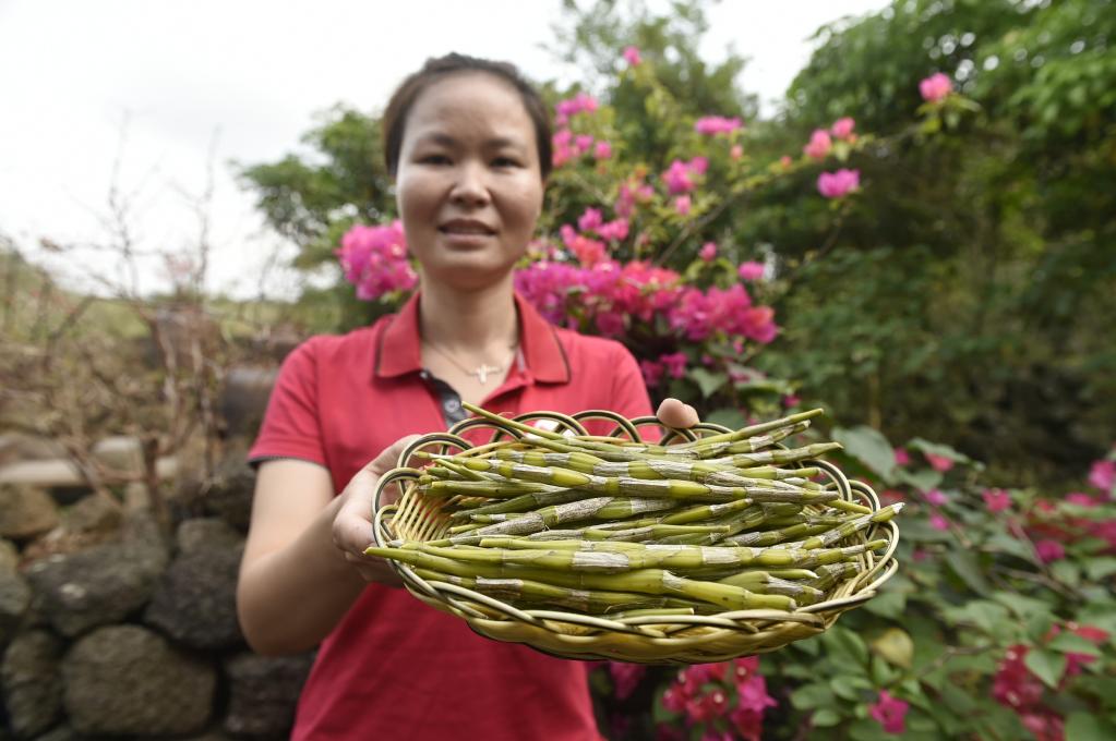 2019年3月14日,村民在海南海口市秀英區石山鎮施茶村石斛園展示新鮮的石斛。新華社記者 魯鵬 攝
