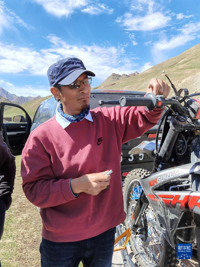 野生動物保護員強巴調試巡邏用的摩托車(資料照片)。新華社發(受訪者供圖)